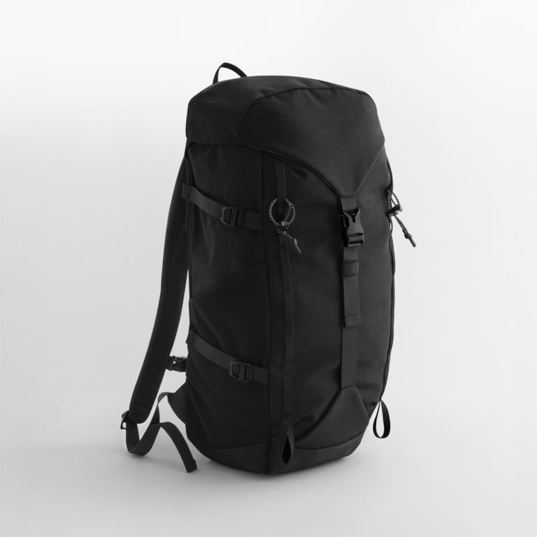 100% gerecycled polyester, GRS-gecertificeerd. Cordura® polyester voor extra stevigheid en duurzaamheid. Waterafstotende coating zonder PFAS. Geschikt voor waterzak. Bovenvak met ritssluiting voor waardevolle spullen. Elastische zijvakken. Gewatteerd rugpaneel van ademend mesh. Ingebouwd regenhoes van hoogzichtbaar 190T polyester. Multifunctionele bevestigingsgespen. Verstelbare, gewatteerde schouderbanden van ademend mesh. Dubbele zijdelingse compressieriemen. Versterkte draaggreep. Bevestigingspunten voor wandelstokken. Afneembaar label voor eenvoudig rebranding.