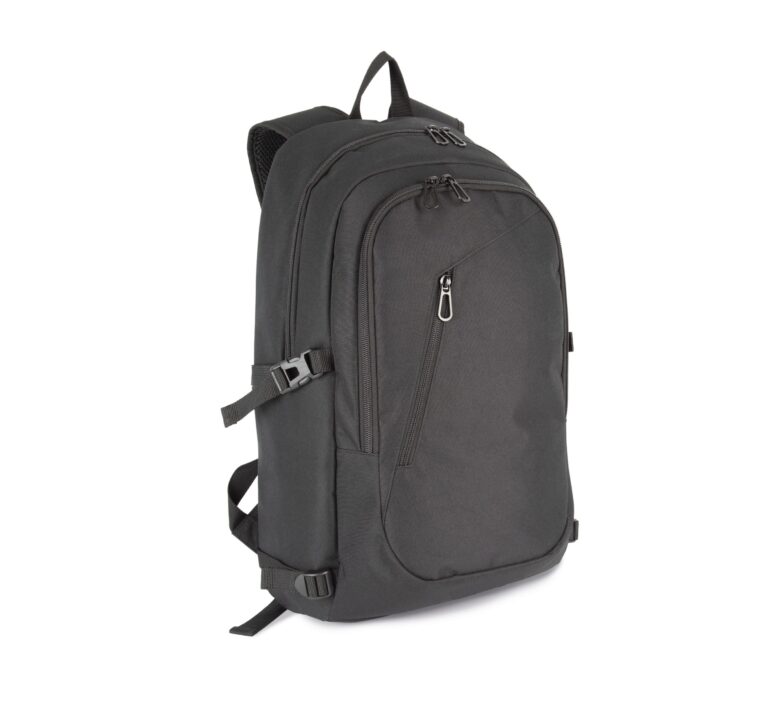 100% polyester. Ingedeeld voorvak met brede opening. Groot hoofdvak met gewatteerde ruimte voor een laptop en zakjes voor accessoires. Verstelbare riemen opzij. Ergonomische, gewatteerde en verstelbare schouderbanden. Op de achterkant zit een riem om de tas aan de handgreep van een trolley te bevestigen, voor makkelijk transport. Veiligheidzak voor een paspoort en gsm op de achterkant. Diagonale zak op het voorpaneel voor eenvoudige personalisatie.