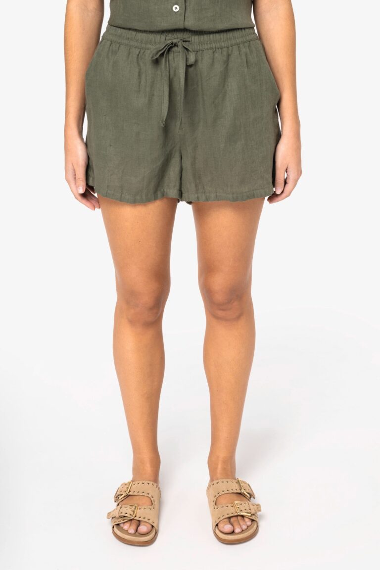 100% linnen. Geweven. Zijzakken. Elastische tailleband met stiksels en plat aanrijgkoordje in dezelfde kleur als de hoofdstof. Geborduurde verluchtingsgaatjes. Verstevigende biessteek aan het kruis voor- en achteraan. Enkel stiksel op de zoom onderaan. Kledingstuk gewassen na montage: mogelijk zijn er kleurverschillen tussen de producten.