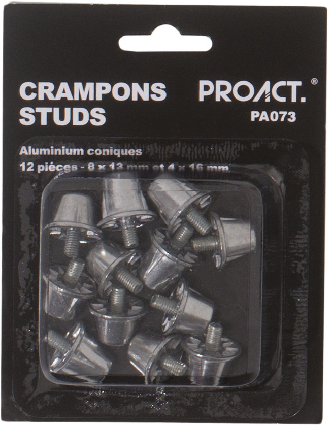 Met de studs van PROACT® geeft u uw schoenen een unieke uitstraling. Deze kegelvormige aluminium noppen zijn de perfecte oplossing voor het personaliseren van uw sortschoenen. Verkrijgbaar in een verpakking van 12, bieden ze veelzijdigheid en stijl in één.
