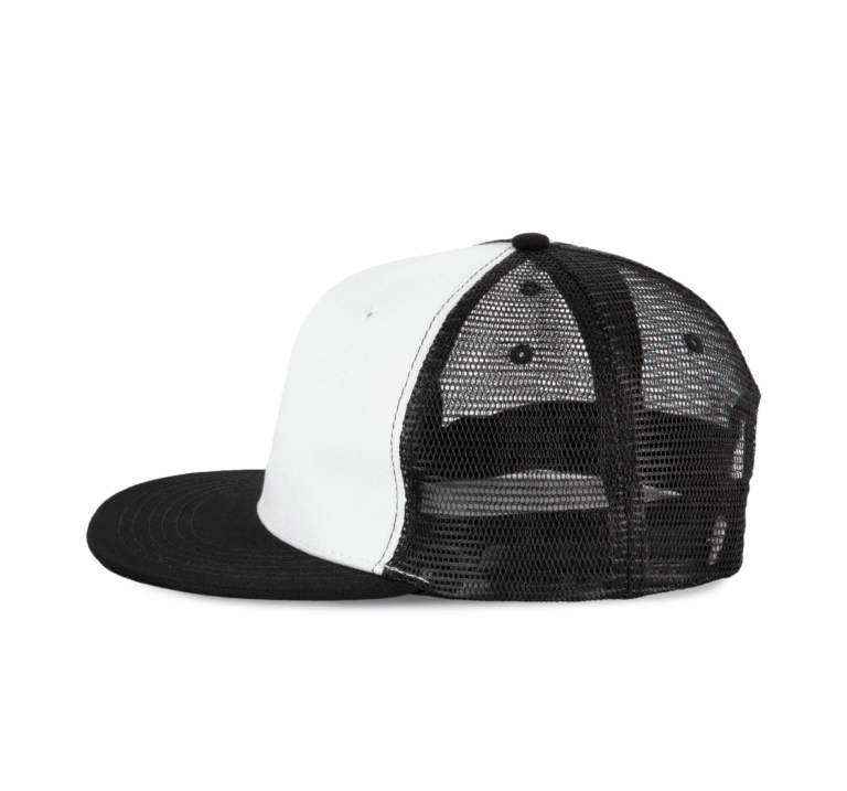 De trucker pet is vervaardigd uit 100% katoen met een ademend polyester mesh. Met zijn 6 verstevigde panelen en platte klep is deze pet zowel duurzaam als stijlvol. De katoenen zweetband zorgt voor extra comfort tijdens gebruik, terwijl de verstelbare plastic sluiting een perfecte pasvorm garandeert.