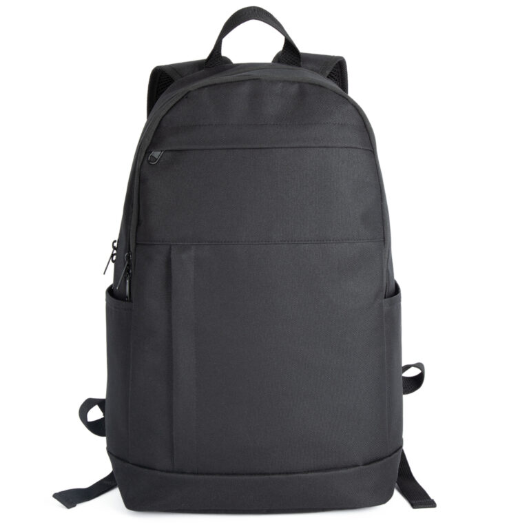 100% polyester. Werkrugzak met binnenin vakken voor laptops tot 15″. Groot hoofdvak voor documenten. Zakken vooraan, waaronder één met rits, één horizontale en één verticale, voor eenvoudige personalisatie. Comfortabele en ademende achterkant van mesh.